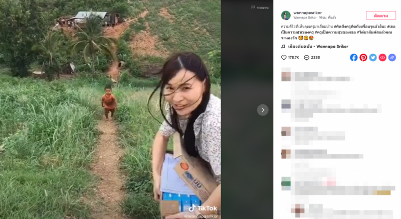 โดยหนูน้อยในคลิปเป็นเด็กโรงเรียนบ้านเขาแก้ว ต.วังกะทะ จ.นครราชสีมาซึ่งสมาชิกtiktok รายนี้ยังได้ระบุข้อความประกอบคลิปสุดประทับใจอีกว่า ความดีใจที่เห็นคุณครูมาเยี่ยมบ้าน คิดถึงครูคิดถึงเพื่อนๆแล้วสินะ เธอเป็นความสุขของครู ครูเป็นความสุขของเธอ ได้มาสัมผัสแล้วคุณจะหลงรัก