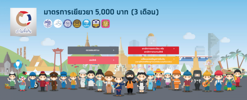 จากกรณี รัฐบาลเปิดมาตรการช่วยเหลือลูกจ้างชั่วคราว อาชีพอิสระ นอกระบบประกันสังคม ที่ได้รับผลกระทบ จะได้รับเงินสนับสนุนรายละ 5,000 บาทต่อเดือน โดยต้องลงทะเบียนผ่านเว็บไซต์ www.เราไม่ทิ้งกัน.com เท่านั้น ซึ่งล่าสุดได้ปิดการลงทะเบียนขอรับสิทธิ์ไปแล้ว แต่ยังเปิดเว็บให้ตรวจสอบสถานะ, ยกเลิกการลงทะเบียน, เปลี่ยนแปลงข้อมูลการรับเงิน และยื่นข้อมูลเพิ่มเติมได้