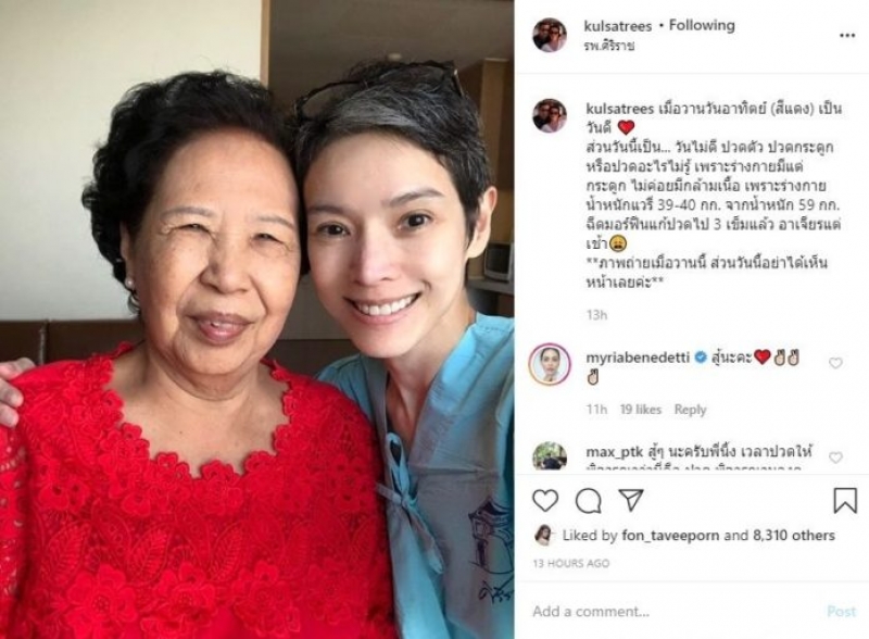 แฟนคลับยังแห่ส่งให้กำลังใจรัวๆ สำหรับ อดีตนางเอก นิ้ง กุลสตรี ล้นหลาม หลังวันจันทร์ที่ผ่านมา นิ้ง โพสต์ภาพคู่ พร้อมแคปชั่นว่า เมื่อวานวันอาทิตย์ (สีแดง) เป็นวันดี ส่วนวันนี้เป็น วันไม่ดี ปวดตัว ปวดกระดูก หรือปวดอะไรไม่รู้ เพราะร่างกายมีแต่กระดูก ไม่ค่อยมีกล้ามเนื้อ เพราะร่างกายน้ำหนักแวรี่ 39-40 กก. จากน้ำหนัก 59 กก. ฉีดมอร์ฟีนแก้ปวดไป 3 เข็มแล้ว อาเจียรแต่เช้า ภาพถ่ายเมื่อวานนี้ ส่วนวันนี้อย่าได้เห็นหน้าเลยค่ะ โดยมีทั้งคนบันเทิงและแฟนคลับเข้ามาคอมเมนต์ให้กำลังใจจำนวนมากให้สู้ๆ
