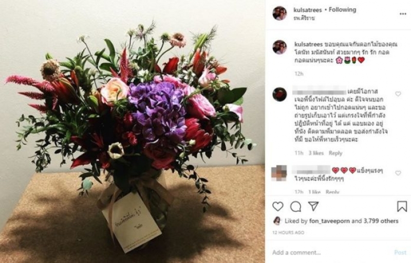 นิ้ง ยังได้โพสต์ภาพแจกันดอกไม้สวยๆ พร้อมแคปชั่นขอบคุณคนในวงการบันเทิงล่าสุดที่ส่งไปให้กำลังใจด้วยว่า “ขอบคุณแจกันดอกไม้ของคุณ โดนัท มนัสนันท์ สวยมากๆ รัก รัก กอด กอดแน่นๆนะคะ”